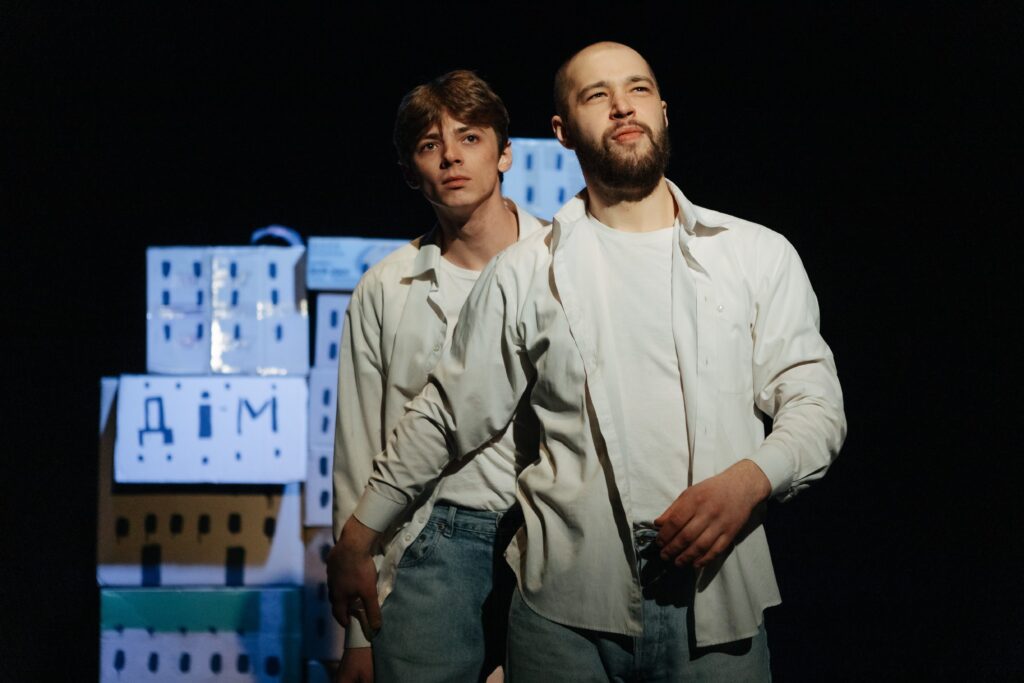 Entstanden im Frühjahr 2023, erzählt das Stück die Geschichte zweier Brüder und eines Hundes, die zwischen Sirenen und Stromausfällen versuchen, ihren Alltag zu bestreiten. Dabei geht es nicht um Soldaten, Politik und große Heldengeschichten, sondern um alltägliche Fragen: Wie gehst du mit dem Hund raus, wenn über dir die Raketen fliegen? Wo besorgst du dir Essen, wenn die Supermärkte geschlossen sind? Wie gehst du in den Tag, wenn das normale Leben zum Stillstand gekommen ist? Mit viel Humor und ohne Sprache erzählen die beiden Spieler eine eindringliche Geschichte über Resilienz und die Absurdität des (Über-)Lebens in einer Frontstadt.